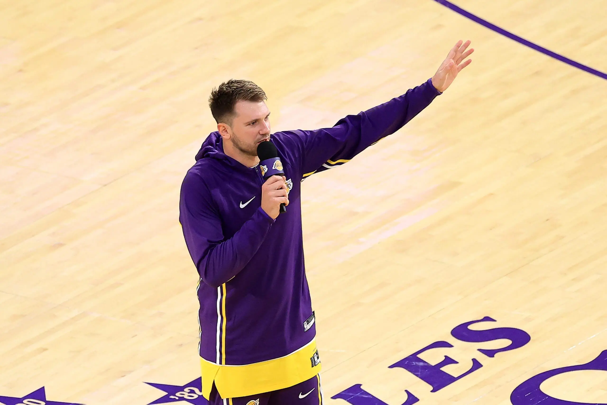 As the arena thundered “Luka! Luka!”, he didn’t celebrate with teammates. Instead, he marched to mid-court, microphone in hand – a prop from the halftime emcee, forgotten in the chaos – and pivoted toward the VIP suites.